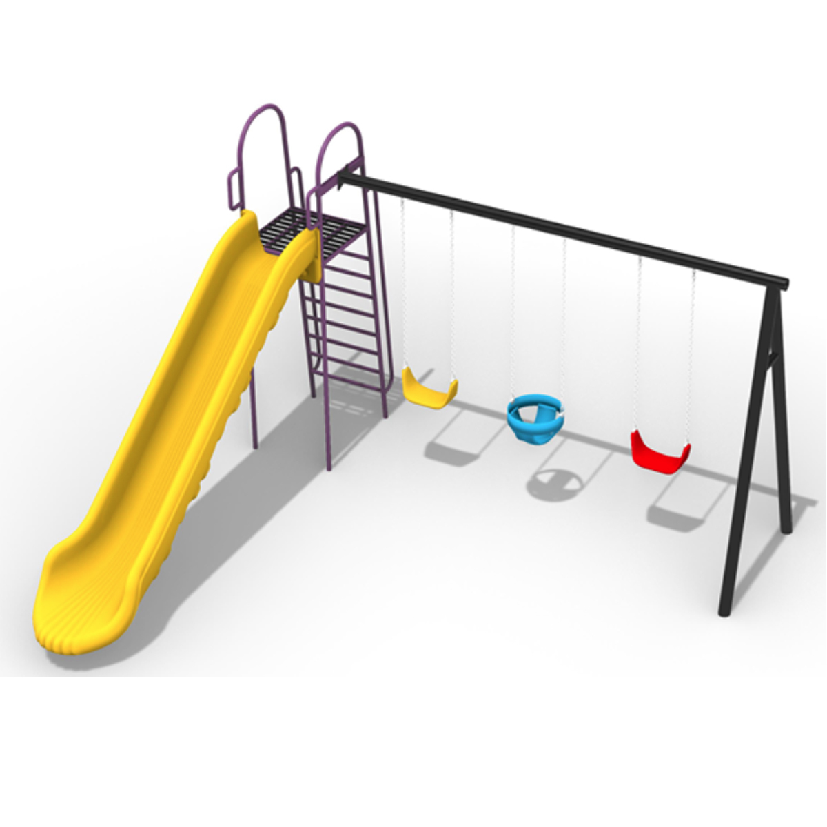 Juego de exterior compacto que combina una resbaladilla recta grande con una estructura de tres columpios (uno tipo bebé y dos de banda). Ideal para estimular el equilibrio y la motricidad gruesa en jardines y parques pequeños.