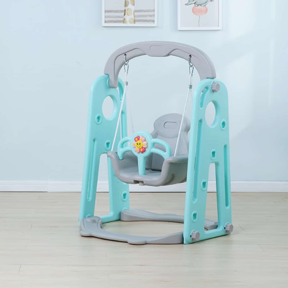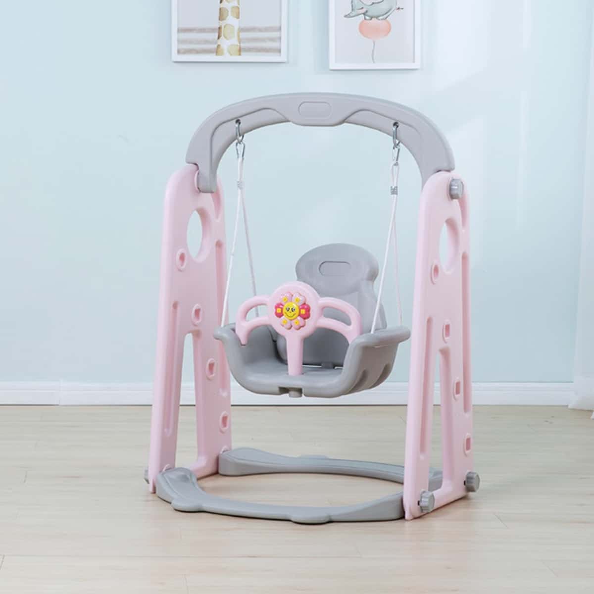 Columpio portabebé de plástico rotomoldeado colores rosa y azul.