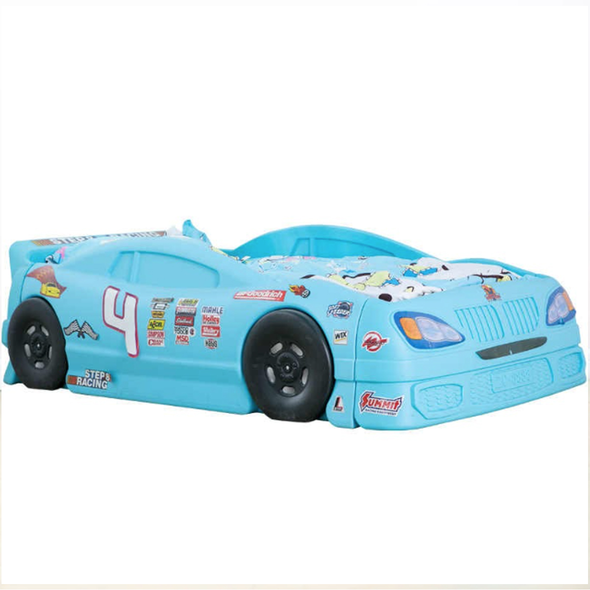 Cama individual temática con diseño de coche de carreras deportivo. Ofrece protección contra caídas con bordes altos y crea una transición divertida de la cuna a la cama grande. Los detalles de las etiquetas le dan un aspecto auténtico de pista.