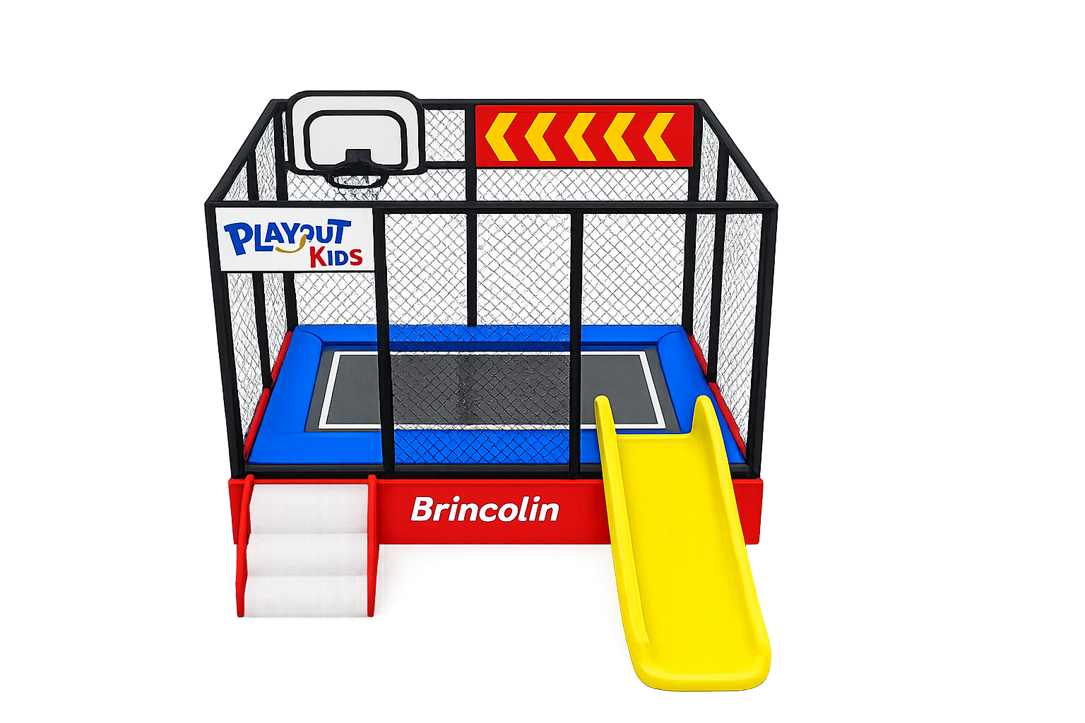 Cama elastica, una resbaladilla, un tablero de basquetbol. red perimetral y escalones de acceso