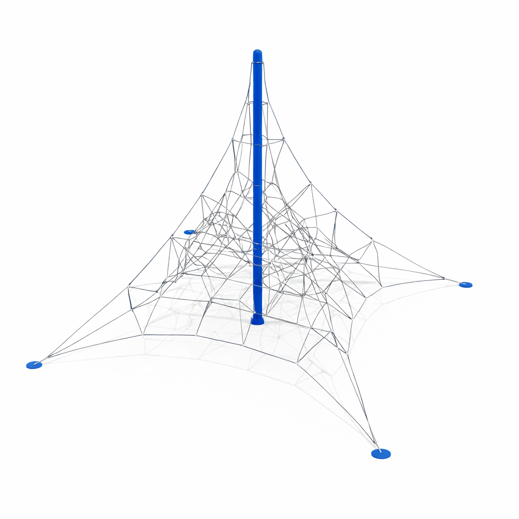 La escaladora con una estructura en forma de cono, una red de cuerdas rojas para trepar y un poste central azul que conecta los niveles, diseñada para niños en parques o áreas de juego infantiles.