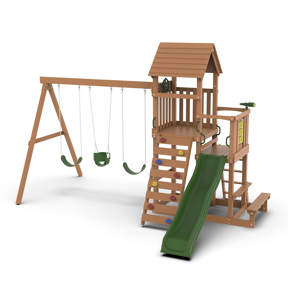 Set de juego residencial de madera diseñado para espacios exteriores del hogar. El Huasteca Playset integra múltiples actividades en una sola estructura, fomentando el desarrollo motriz, el equilibrio y la imaginación de los niños en un entorno seguro. Inspirado en la Región Cultural Huasteca del noreste de México, forma parte de la nueva línea residencial PlayoutKids con más de 25 años de experiencia en equipamiento recreativo en México.