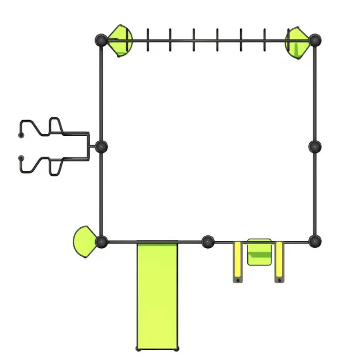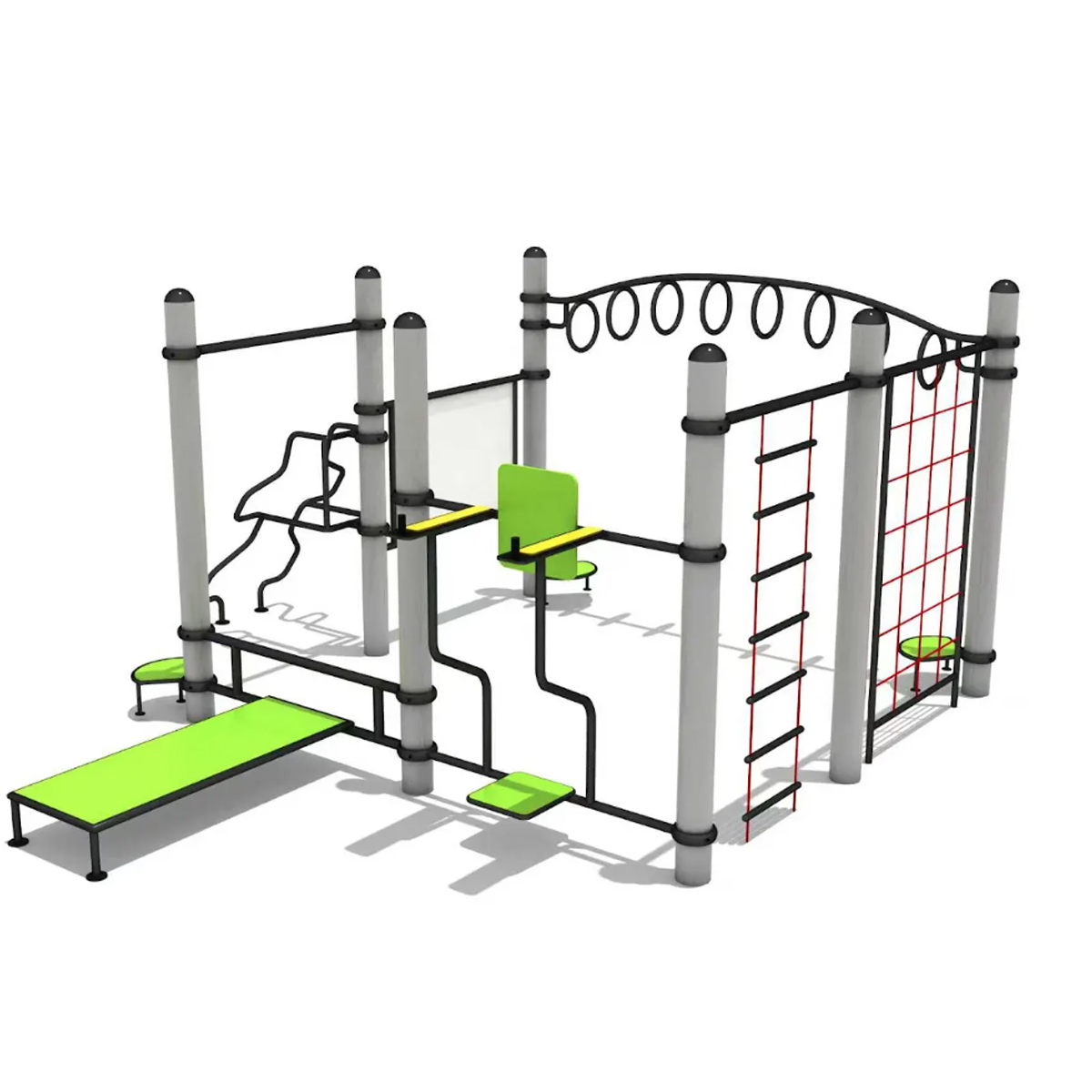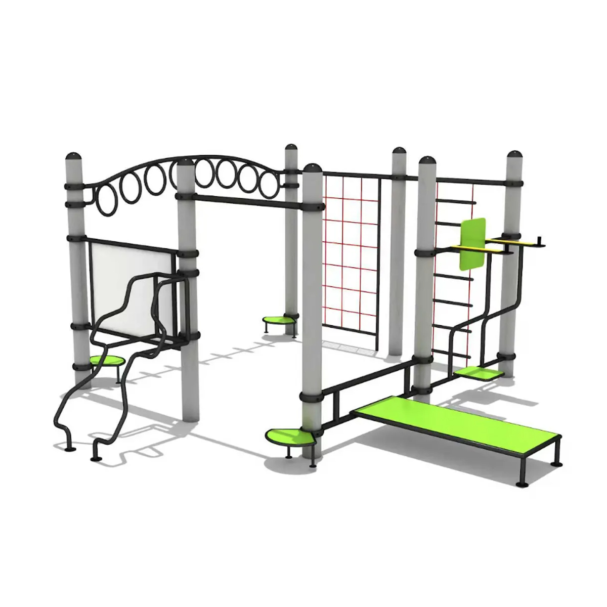 Material: Estructura y postes de acero galvanizado o carbono, con acabado de pintura electrostática para máxima resistencia a la intemperie y corrosión. Componentes plásticos (asientos, plataformas) de polietileno de alta densidad