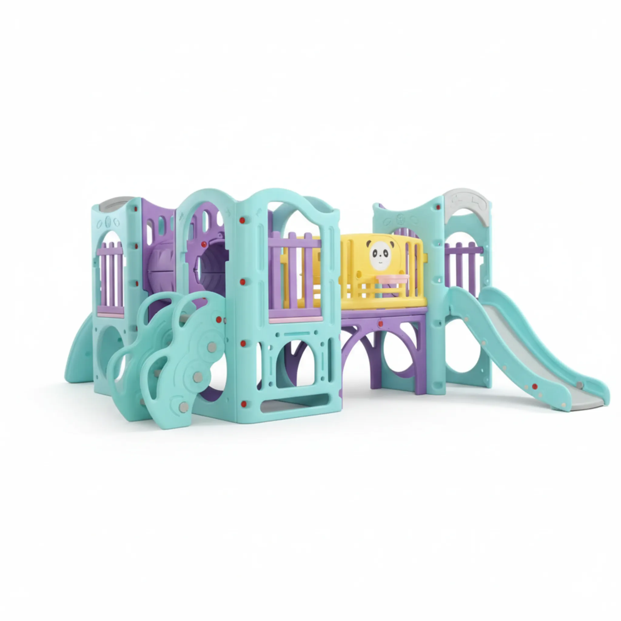 Medidas: 3.85 x 2.85 x 1.45 Material: Plástico rotomoldeado Edades: 1 a 3 años Capacidad: 8 a 10 niños Actividades que incluye: Una rampa de acceso, una escalera de acceso, una resbaladilla sencilla, túnel, puente, estructura de plástico.