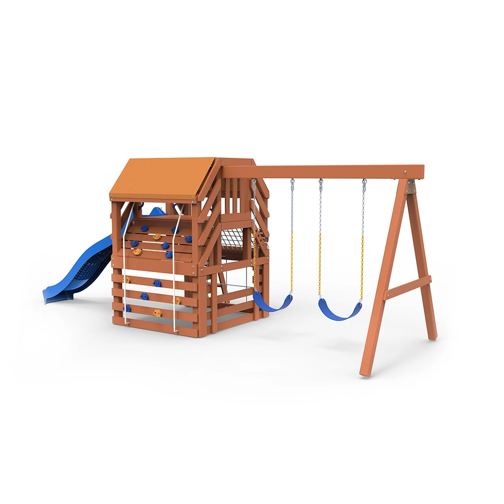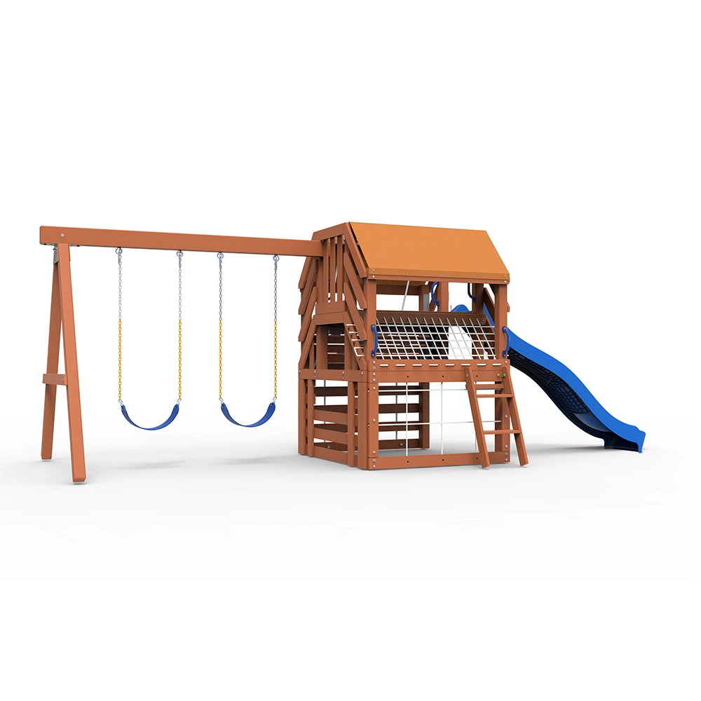 Set de juego residencial de madera diseñado para espacios exteriores del hogar. El Yelapa Playset integra múltiples actividades en una sola estructura, fomentando el desarrollo motriz, el equilibrio y la imaginación de los niños en un entorno seguro. Inspirado en el pueblo de Yelapa en Jalisco, forma parte de la nueva línea residencial PlayoutKids con más de 25 años de experiencia en equipamiento recreativo en México.